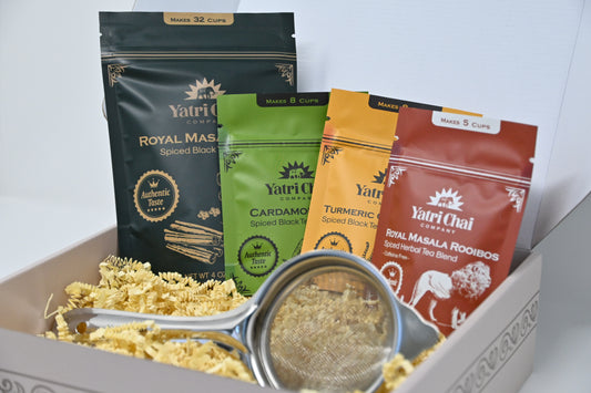 Yatri Chai's fragrant chai blends combine robust black tea with a symphony of aromatic spices—think cardamom, cinnamon, ginger, cloves, and more—creating a warm, invigorating experience. Our masala chai is ideal for morning rituals, cozy afternoons, or grab a Rooibos blend for a caffeine-free, evening treat.