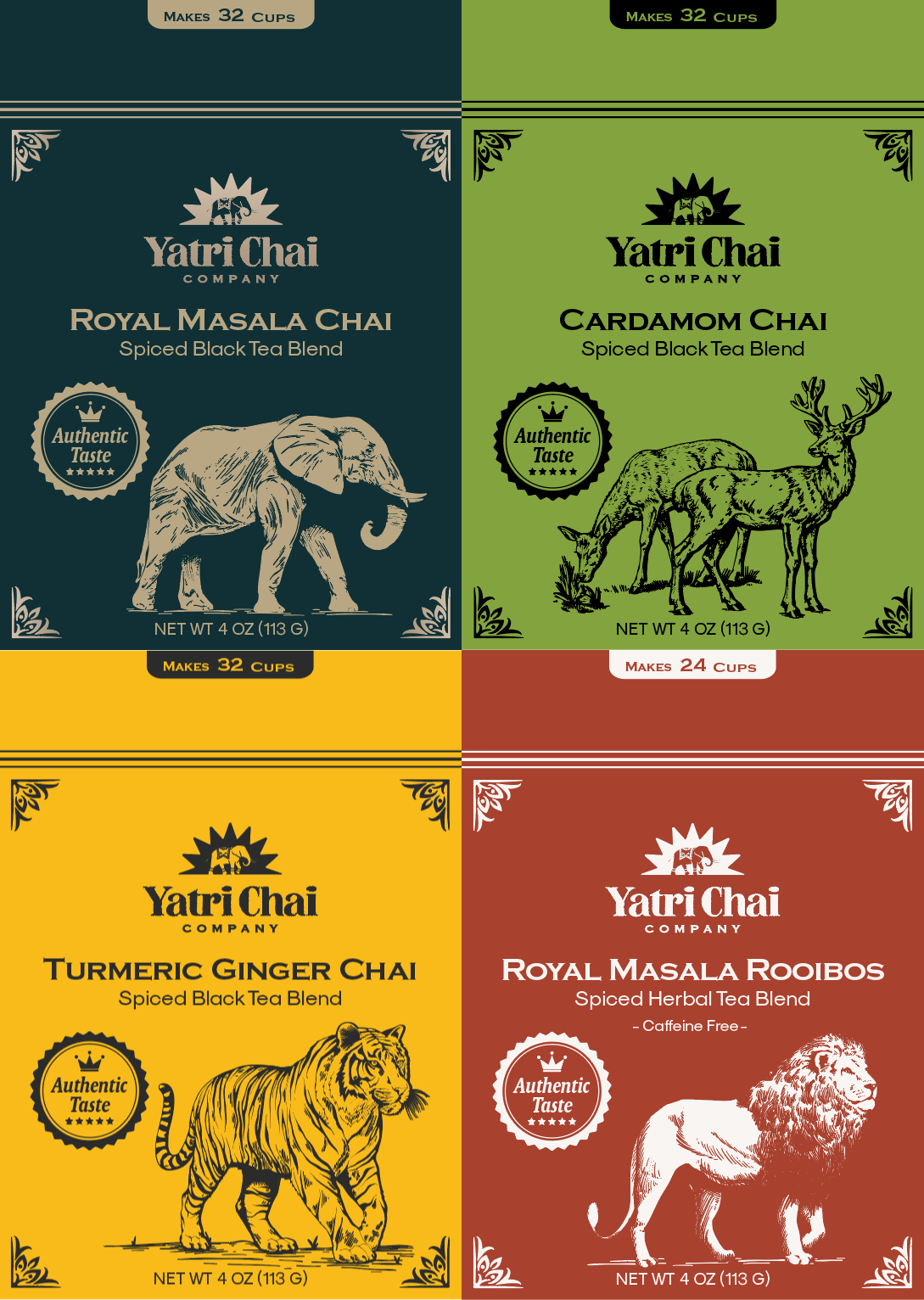 Whether you're exploring new flavors or sharing the gift of authentic chai, this bundle is perfect for every chai lover. Available in generous 4oz pouches for the chai enthusiast. If you're interested in our smaller 1oz pouch bundle, see Classic Chai Bundle (Small).