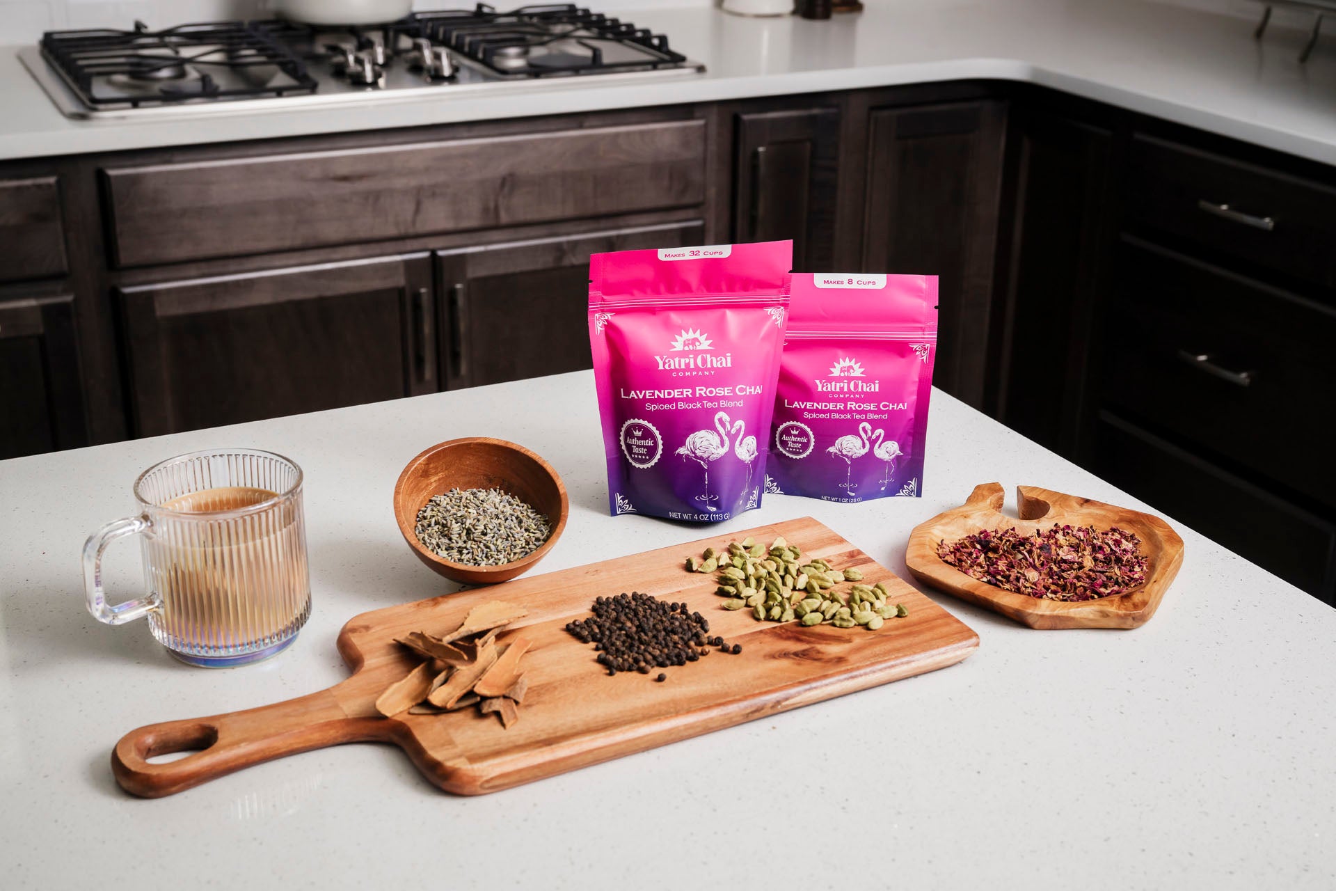 Lavender Rose Chai is a more expressive take on masala chai—where bold black tea and warming spices open into floral notes that feel lifted and expansive.